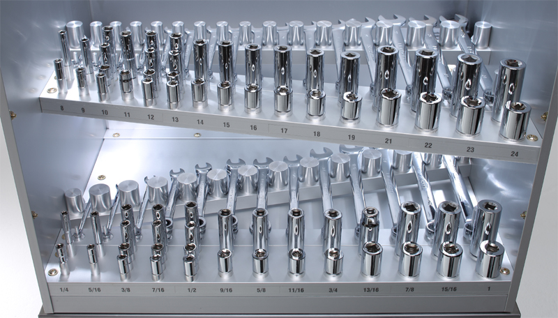 Sockets and wrenches of the same size are stored inline. That means you will have to look in only one place for whatever size you need - regardless of whether it is a socket or a wrench, or if it is 1/4", 3/8", or 1/2" drive, or if it is deep well or shallow well. Wrench organizers are open for hand clearance. Upper socket and wrench organizers are angled to improve access to lower socket and wrench organizers. Socket and wrench locations are clearly labeled for easy tool identification.